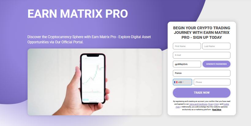Earn Matrix Pro est une plateforme de trading automatisé qui prétend utiliser des algorithmes d’intelligence artificielle (IA) pour analyser les marchés financiers et exécuter des transactions rentables sur le forex, les cryptomonnaies et d’autres actifs numériques. L’objectif est d’aider les utilisateurs – qu’ils soient débutants ou expérimentés – à générer des profits sans avoir besoin de surveiller en permanence les marchés.